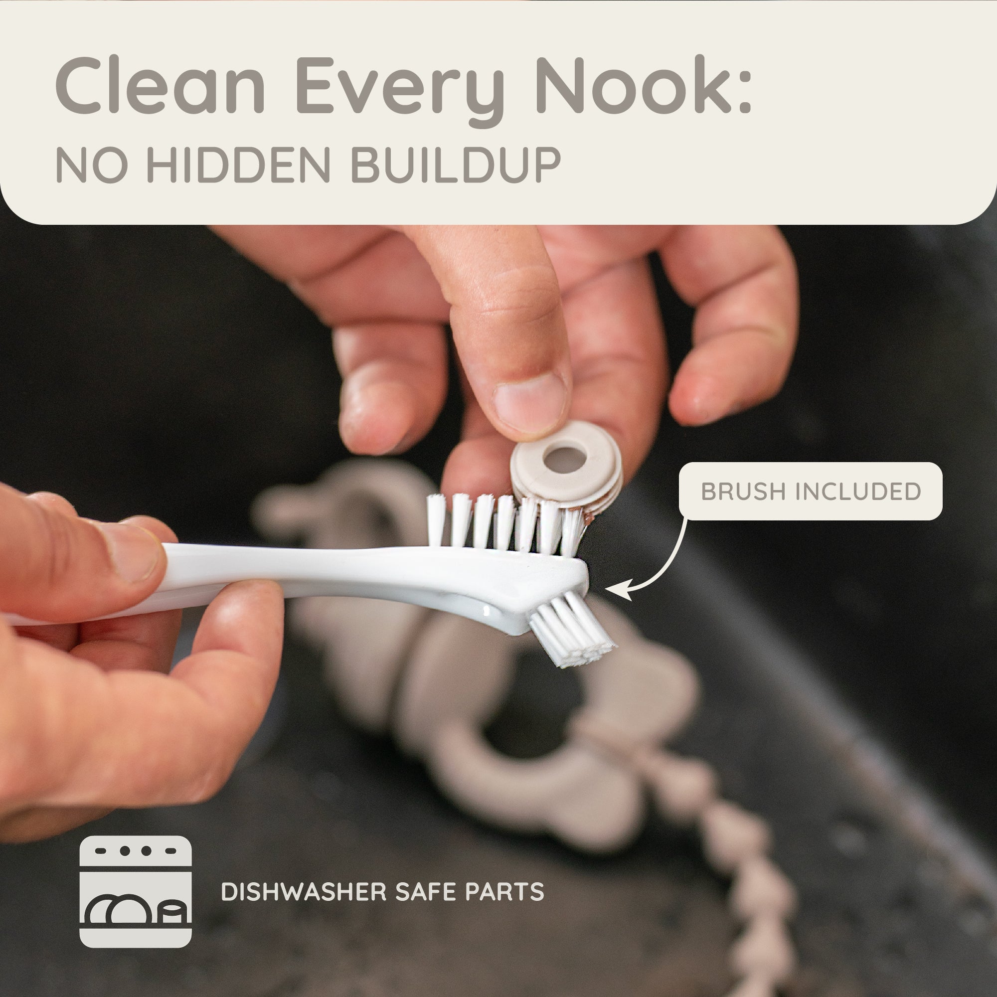 Disassemble all parts and rinse under warm water after each use. Use the included brush to clean inside the silicone pouch. All parts are dishwasher safe — just place them on the top rack. Air dry before next use.