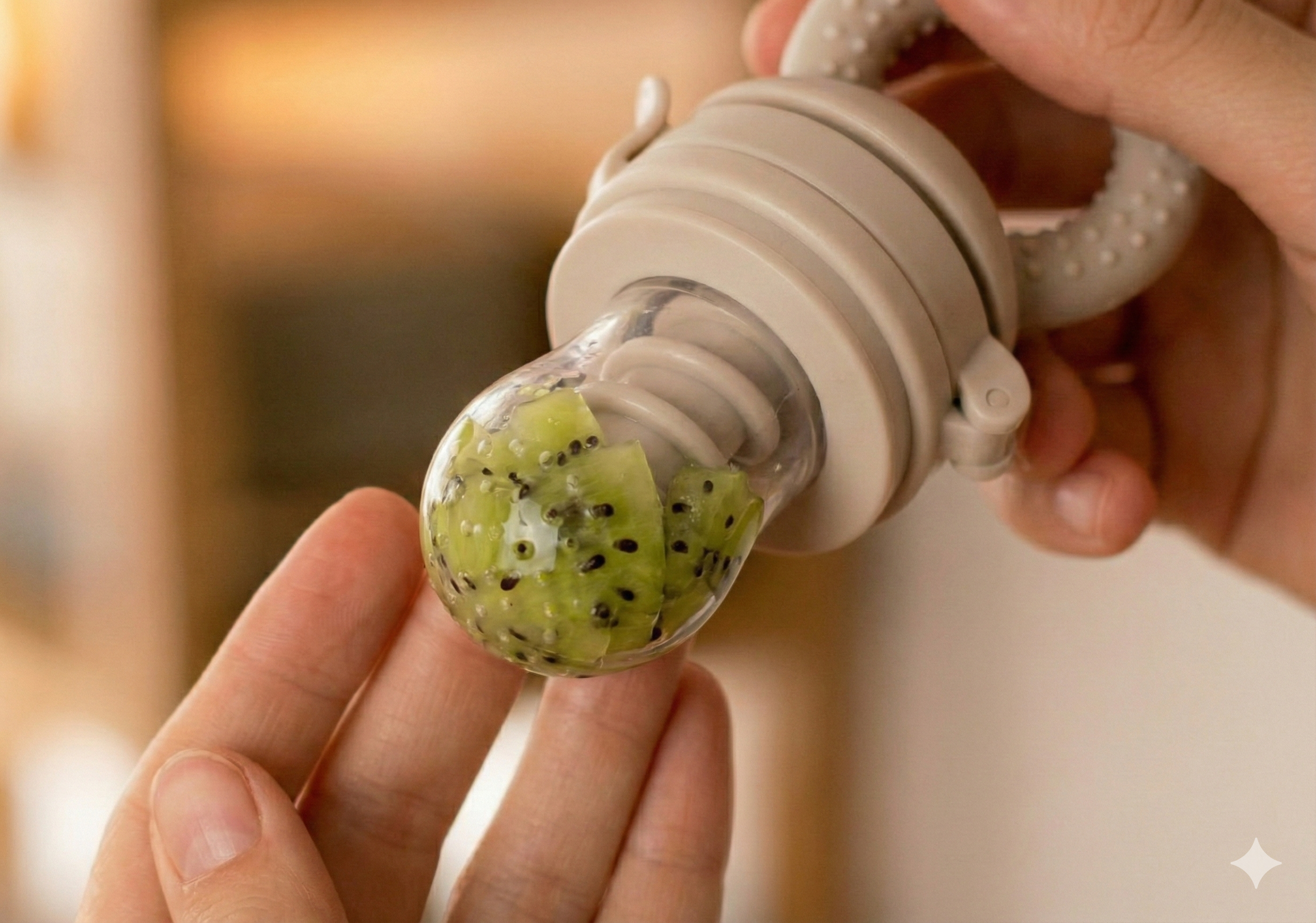 Add soft fruits or steamed veggies into the silicone feeder pouch. Use the built-in plunger to push food to the mesh surface for easy access.